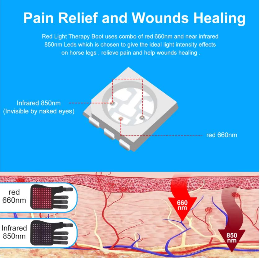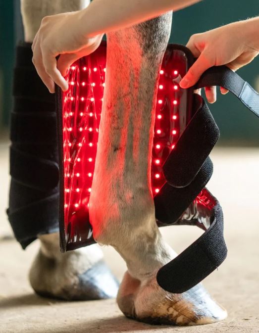 Terapia światłem o długościach fal 660 nm (widzialne czerwone światło) i 850 nm (bliska podczerwień, NIR), często określana jako fotobiomodulacja (PBM) lub terapia laserowa niskiego poziomu (LLLT), zyskała uwagę w medycynie weterynaryjnej jako narzędzie uzupełniające w leczeniu schorzeń koni. PBM działa na poziomie komórkowym, stymulując mitochondria do zwiększenia produkcji adenozynotrifosforanu (ATP), co napędza naprawę i proliferację komórek. Długość fali 660 nm wpływa głównie na powierzchowne tkanki, redukując stres oksydacyjny i promując efekty przeciwzapalne poprzez modulację cytokin, takich jak IL-1β i TNF-α. Natomiast 850 nm przenika głębiej (do kilku centymetrów). Światło NIR promuje rozszerzanie naczyń, potencjalnie poprawiając perfuzję do wału koronowego i lamel, co wspiera szybszą regenerację ściany kopyta (zazwyczaj 1 cm na miesiąc u zdrowych koni) i silniejsze połączenia lamelkowe.Ta forma fotobiomodulacji (PBM) wykorzystuje światło czerwone (660 nm) do płytszego przenikania tkanek w celu wspomagania gojenia powierzchniowego i redukcji zapalenia, podczas gdy światło bliskiej podczerwieni (850 nm) dociera do głębszych struktur, takich jak ścięgna i kości w kopycie.