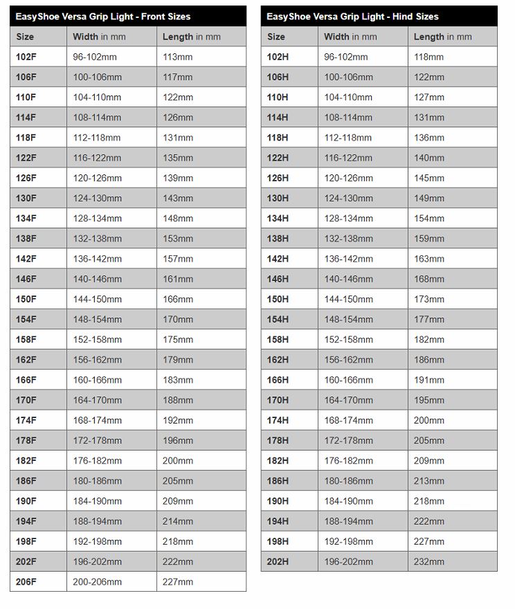 W idealnym przypadku wymiary kopyta konia powinny mieścić się w dolnej granicy zakresu szerokości i nie przekraczać długości podanej obok każdego rozmiaru podkowy. Na przykład, kopyto, które dobrze pasowałoby do rozmiaru 110F, miałoby 104-106 mm szerokości i mniej niż 122 mm długości. W razie potrzeby można łatwo skrócić nadwyżkę szerokości lub długości podkowy, aby dopasować ją do konia.